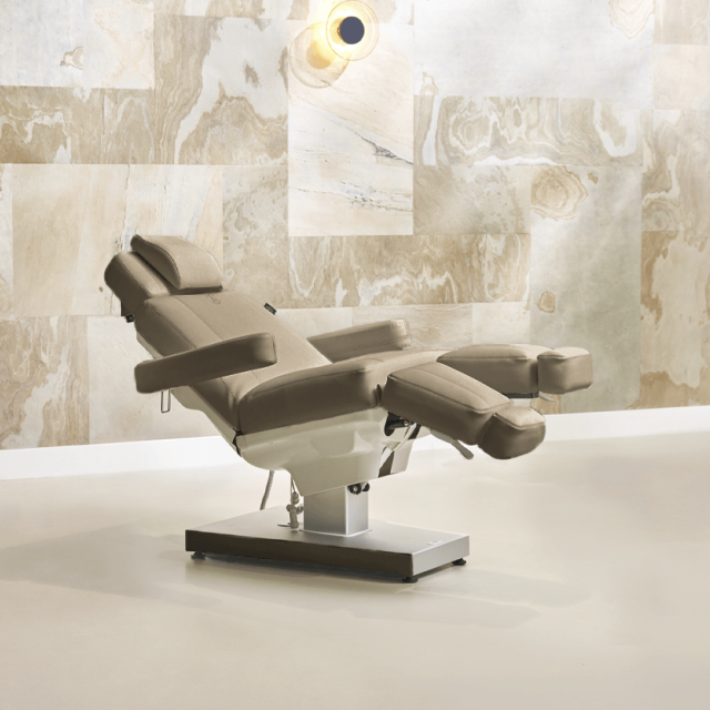 De aluminium voet maakt het mogelijk om verticaal omhoog en omlaag te gaan, hierdoor neemt de stoel minder ruimte in dan vergelijkbare behandelstoelen met een hefboomsysteem. De stoel is uitermate geschikt voor schoonheid en pedicure behandelingen.