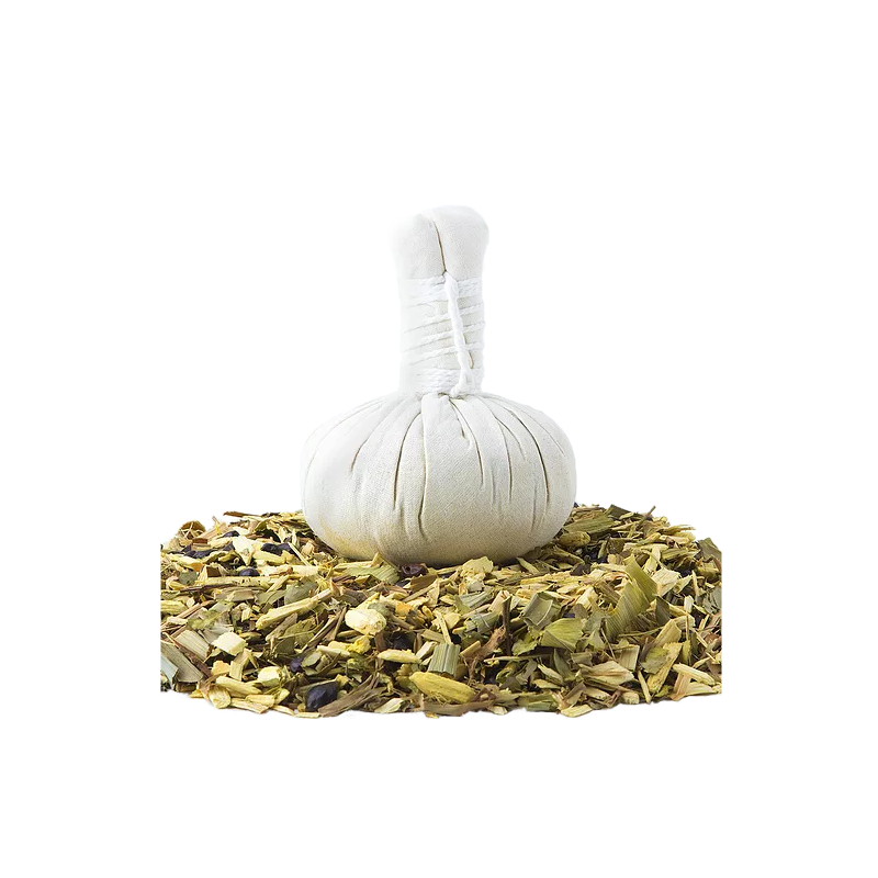 Kruidenstempel lichaam thai. Massagestempel met heerlijk geurende kruiden om lichaam en geest in balans te brengen. Ingrediënten: gember, curcuma, citroengras, kalmoeswortel, kamfer, haaklelie, kaffir limoenschil, sinaasappelschil, tamarinde, schroefpalm.