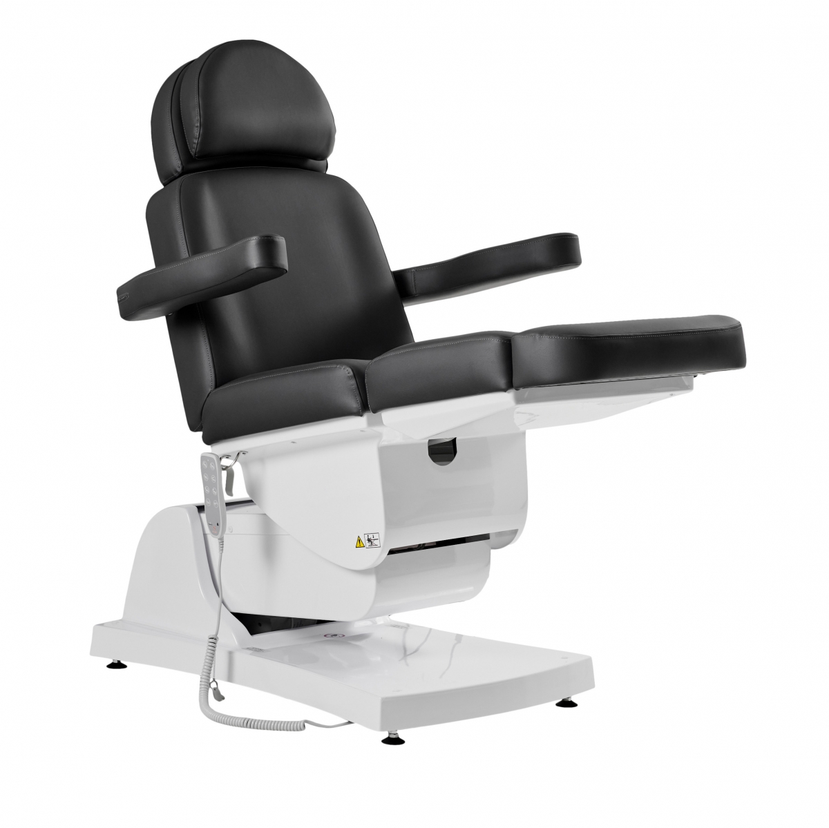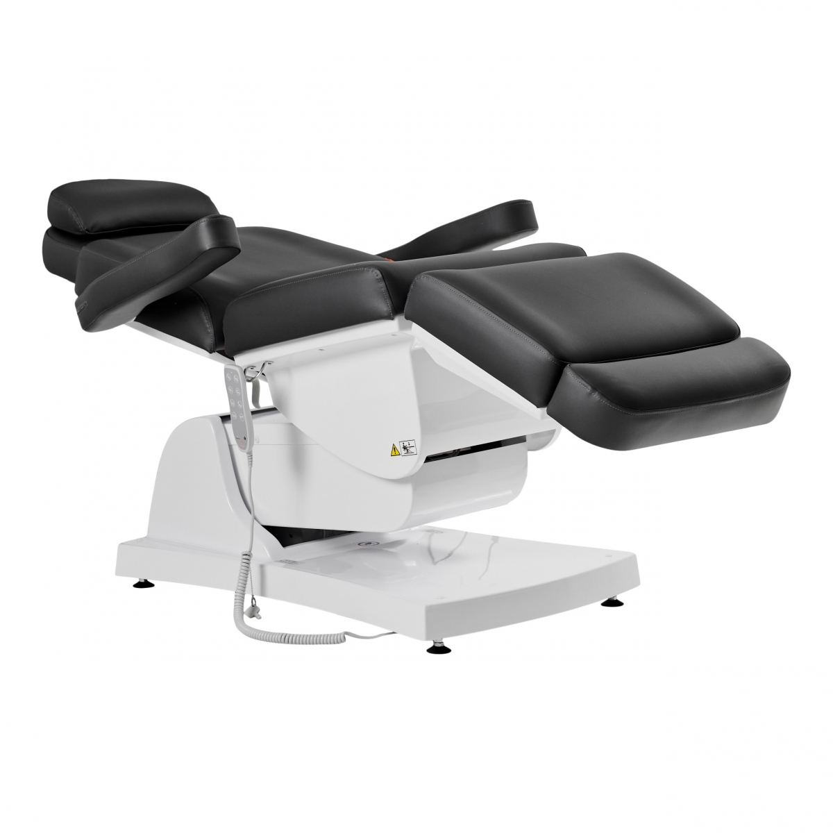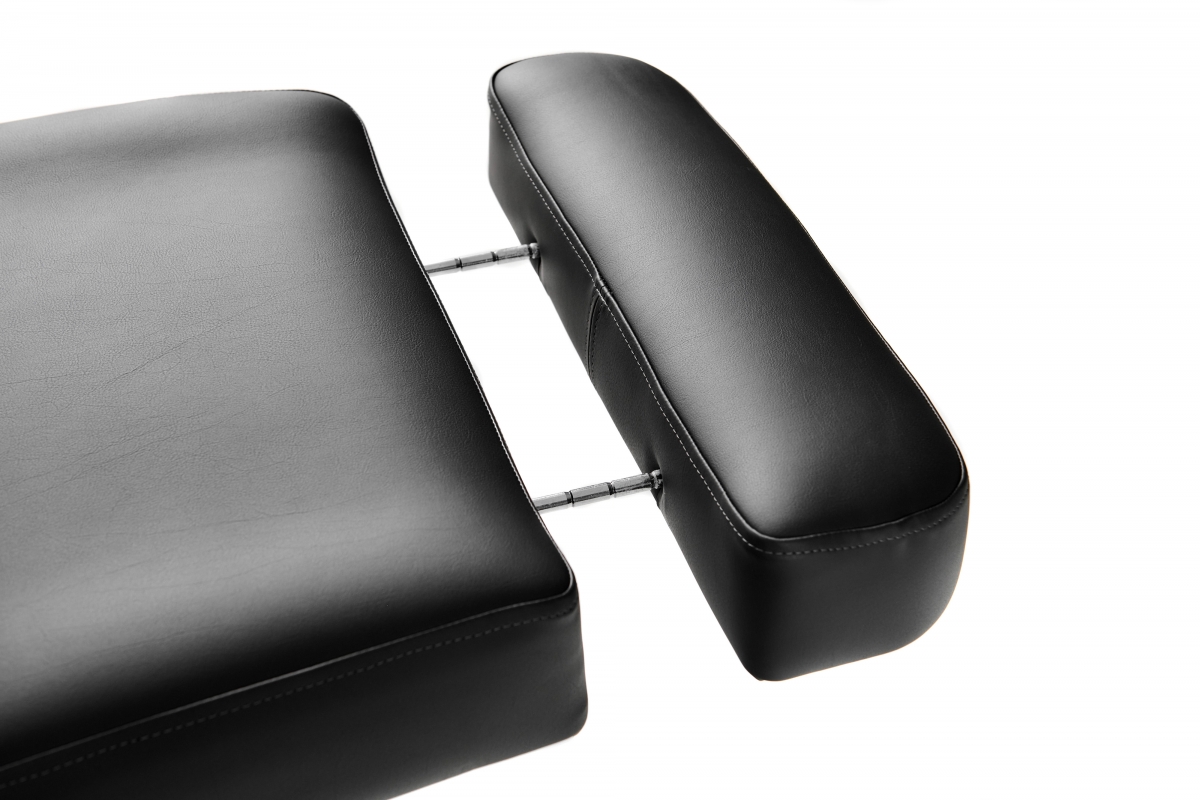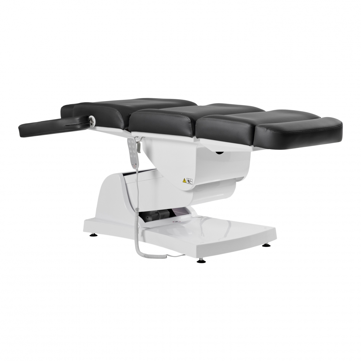 Dit multifunctionele bed is geschikt voor cosmetica, massage en voetverzorging. De hoogte en helling van het bed, evenals het rug- en beengedeelte, kunnen eenvoudig worden aangepast met een afstandsbediening. De vier krachtige motoren lopen soepel en stil. Een comfortabele instap wordt mogelijk gemaakt door het bijna 90° opklapbare beengedeelte. Hoofdsteun en voeteneinde kunnen door uittrekken optimaal worden aangepast aan elke lichaamslengte. Maar ze kunnen ook volledig worden verwijderd. De armleuningen kunnen naar achteren worden geklapt en bewegen met je mee wanneer je de ligpositie aanpast. Er is een gewatteerde gezichtsuitsnede onder het verwijderbare nekkussen.