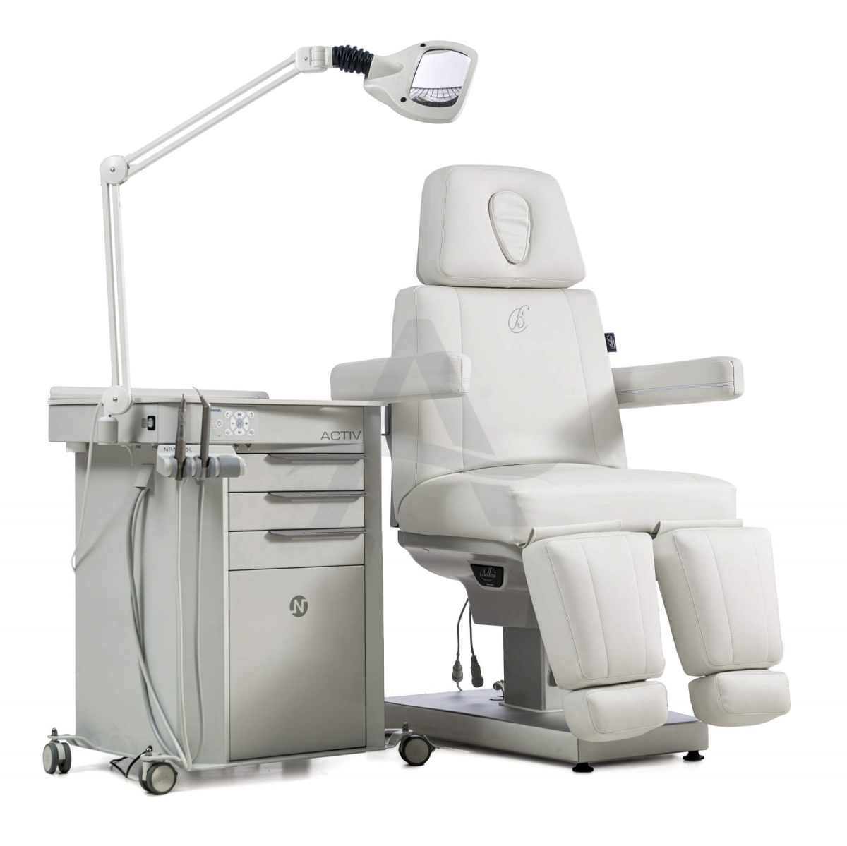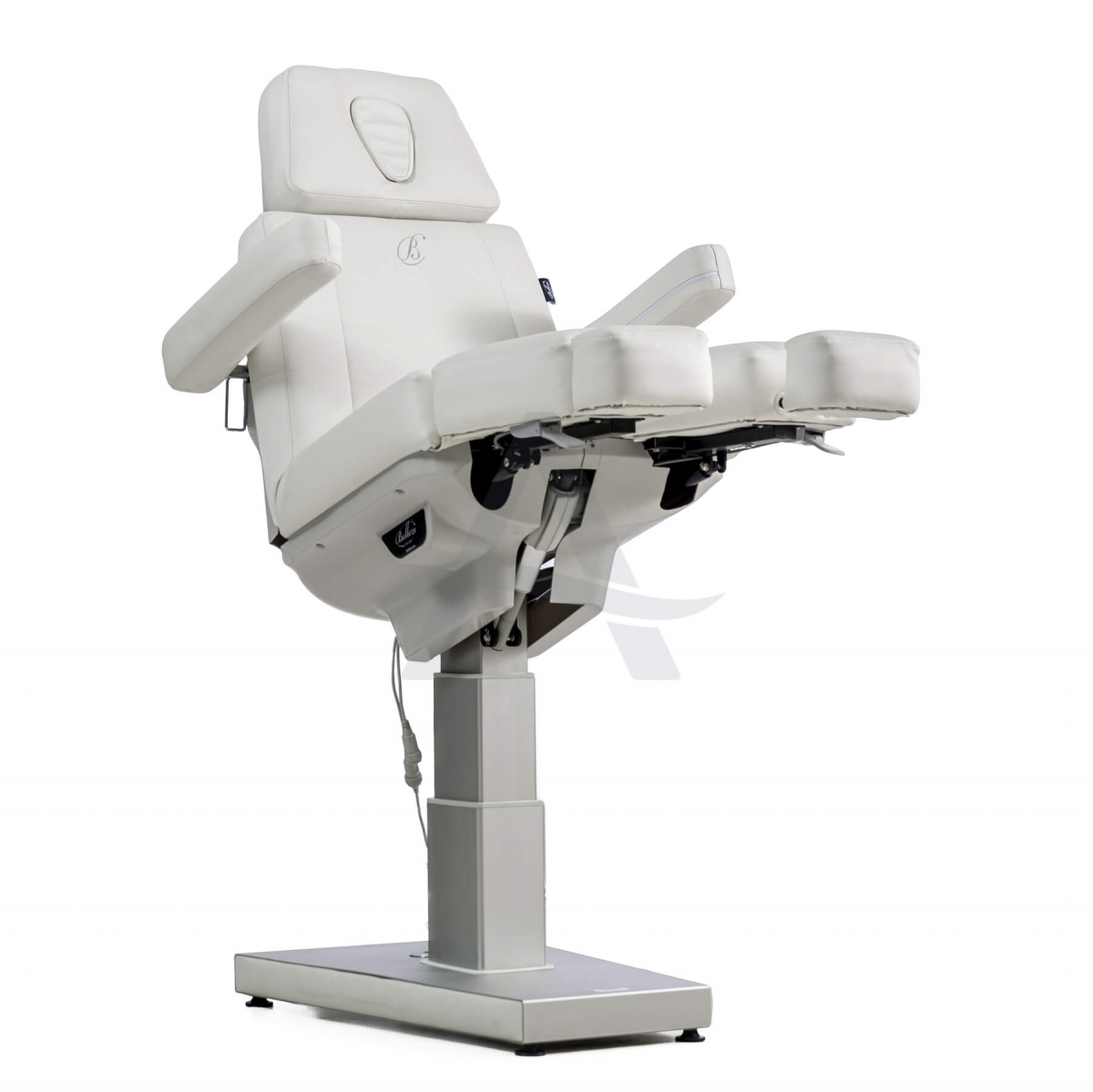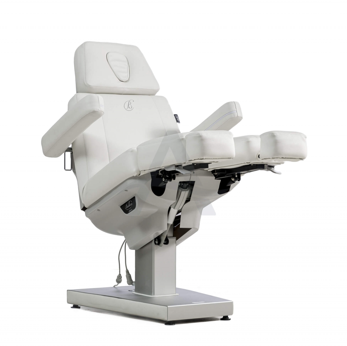 De aluminium voet maakt het mogelijk om verticaal omhoog en omlaag te gaan, hierdoor neemt de stoel minder ruimte in dan vergelijkbare behandelstoelen met een hefboomsysteem. De stoel is uitermate geschikt voor schoonheid en pedicure behandelingen.