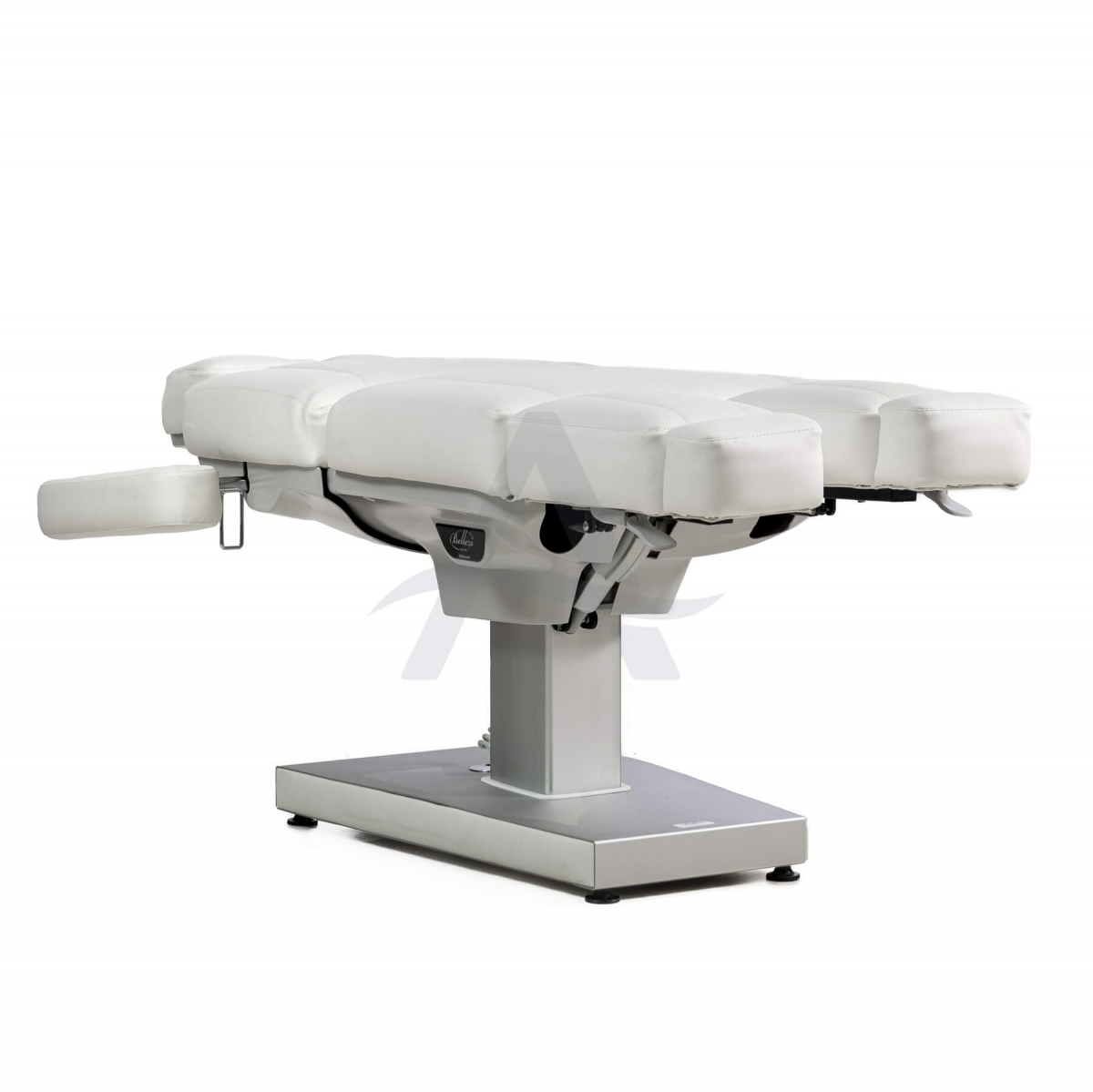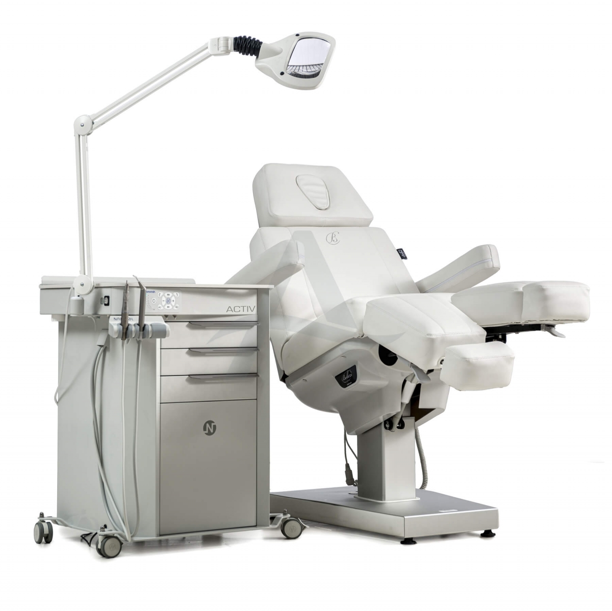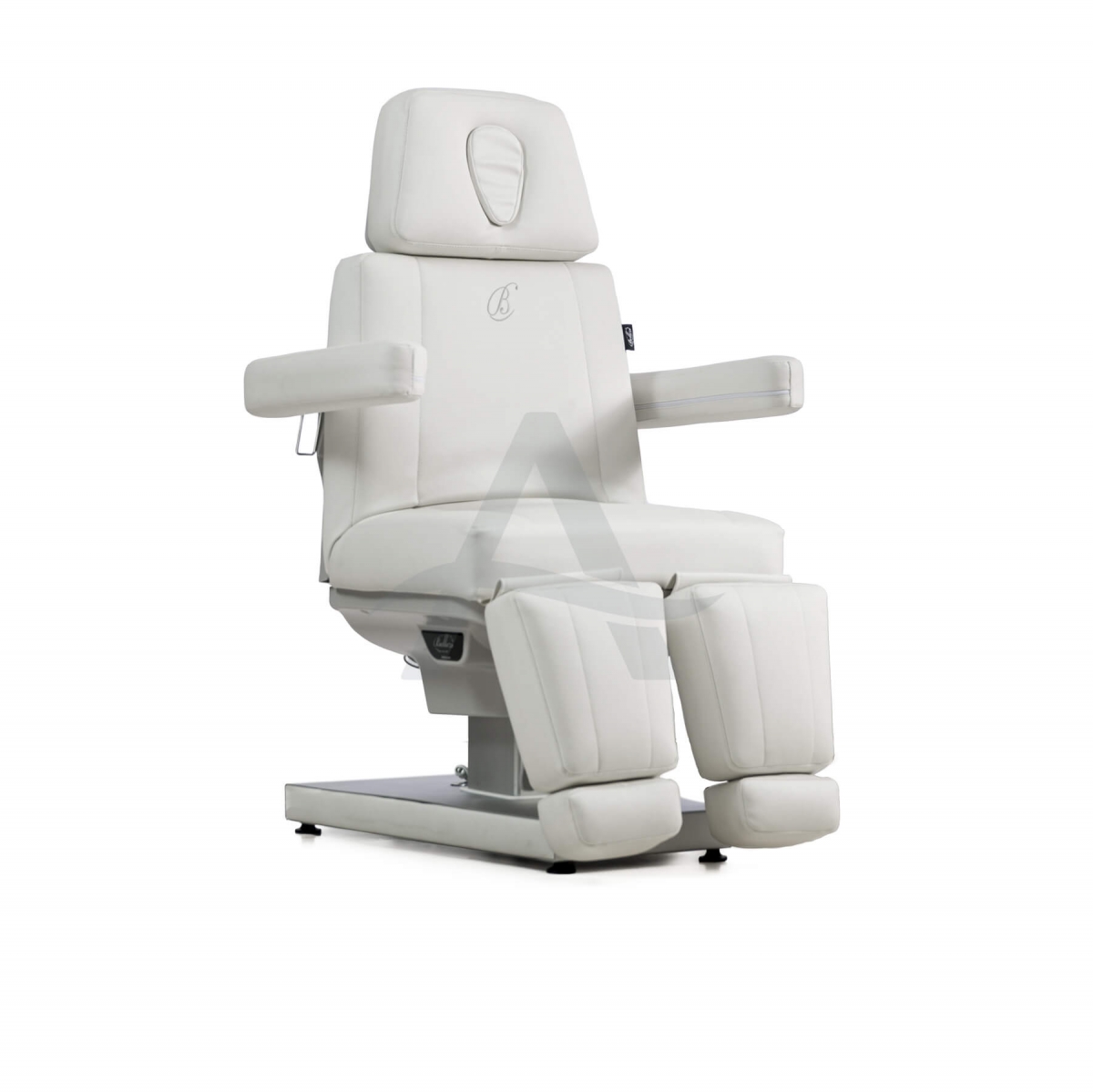 De aluminium voet maakt het mogelijk om verticaal omhoog en omlaag te gaan, hierdoor neemt de stoel minder ruimte in dan vergelijkbare behandelstoelen met een hefboomsysteem. De stoel is uitermate geschikt voor schoonheid en pedicure behandelingen.