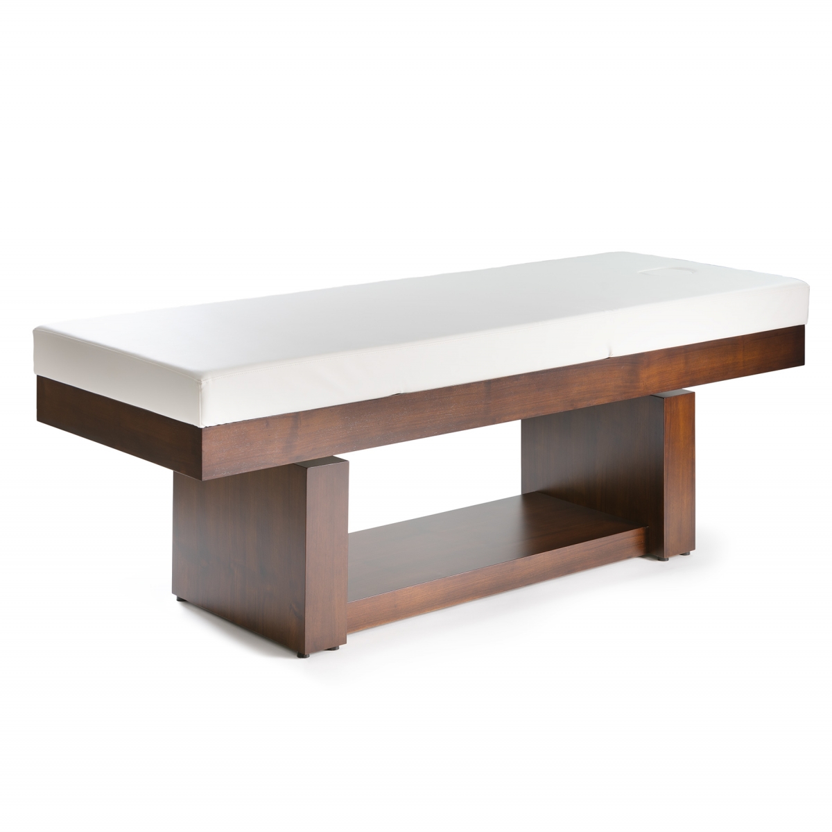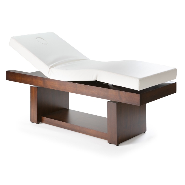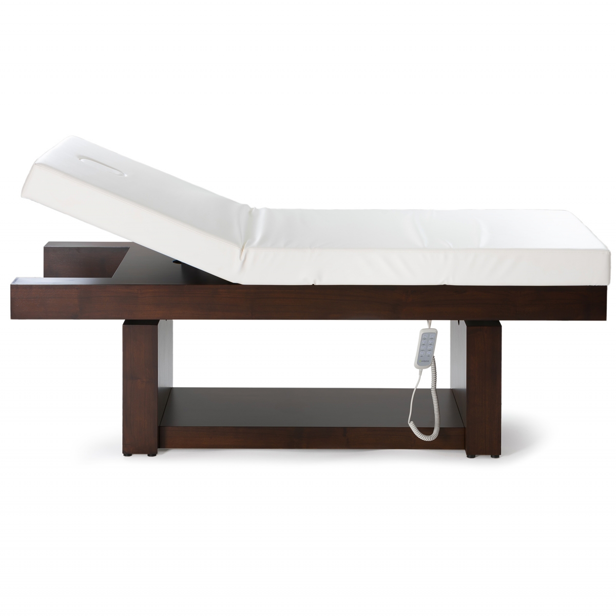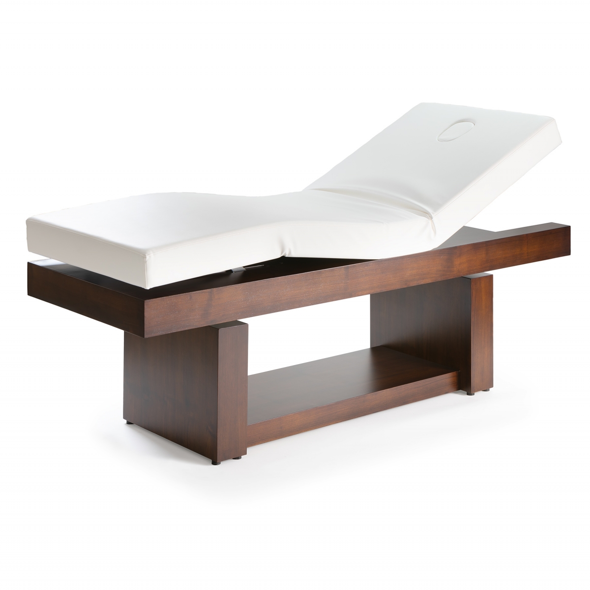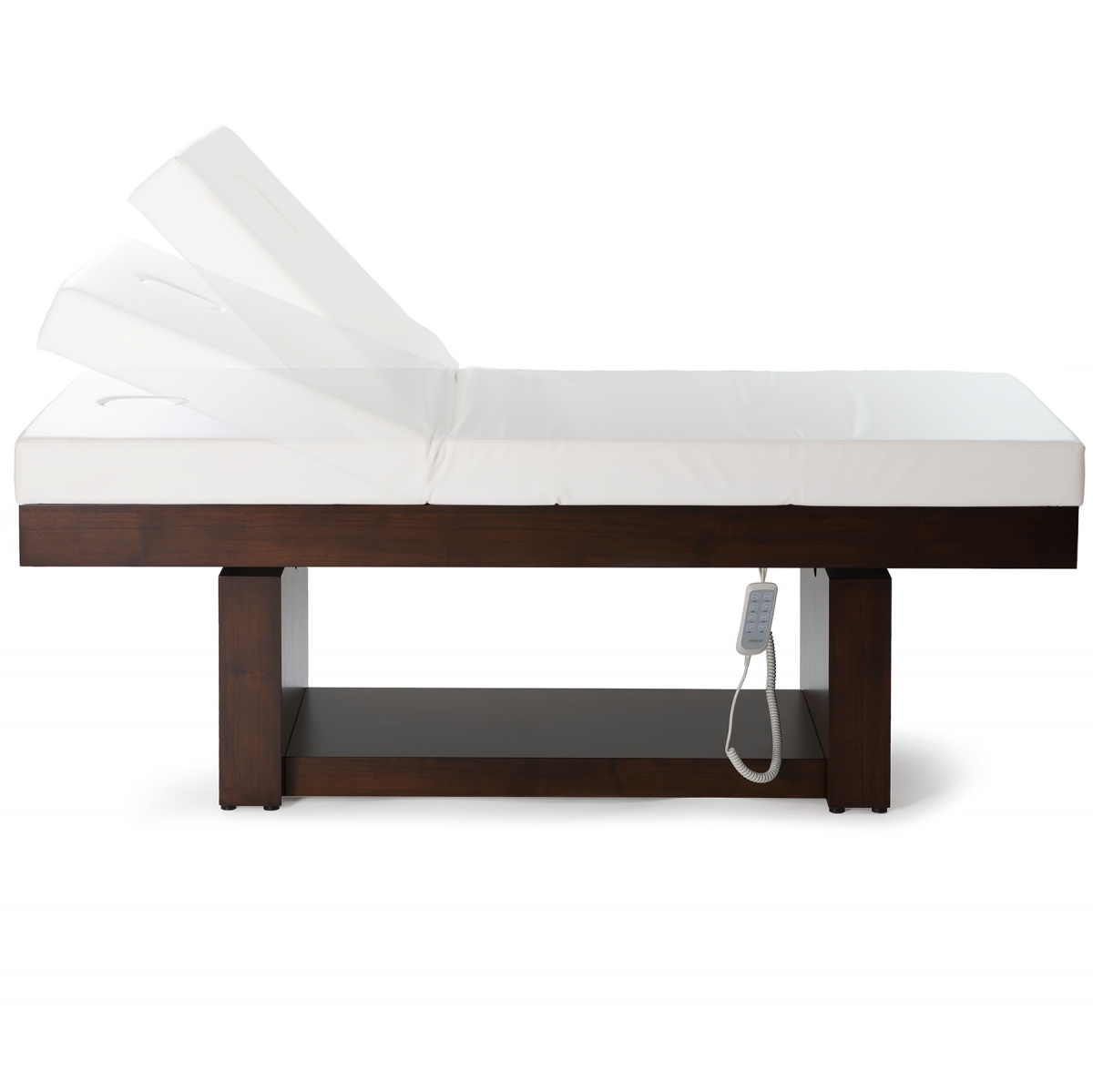 Spa Wellness behandeltafel MANAK heeft een eenvoudige rechtlijnige geometrie waardoor het er erg chique uitziet! Deze professionele elektrische spa-behandeltafel is uitgerust met 4 motoren voor elektrische hoogte-, rugleuning- en beensteunaanpassingen. Het mechanisme voor het verhogen van de rugleuning en de beensteun is sterk vervaardigd met stalen onderdelen en framestructuur. Onder de tafel bevindt zich een voetstuk voor open opbergruimte. Dankzij het speciaal vervaardigde ontwerp kan de therapeut zijn knieën onder de tafel plaatsen en heel dicht bij het gezicht van de cliënt werken tijdens gezichtsmassage of gezichtsbehandelingen. Er is een gezichtsopening en een gezichtsopening in de matras. We gebruikten voorgevormde polyurethaanmatrassen voor demping, zacht aanvoelend brandvertragend kunstleer, Italiaans PU of Aqua Base Coatings. Deze SPA behandeltafel is standaard uitgerust met verwarming.