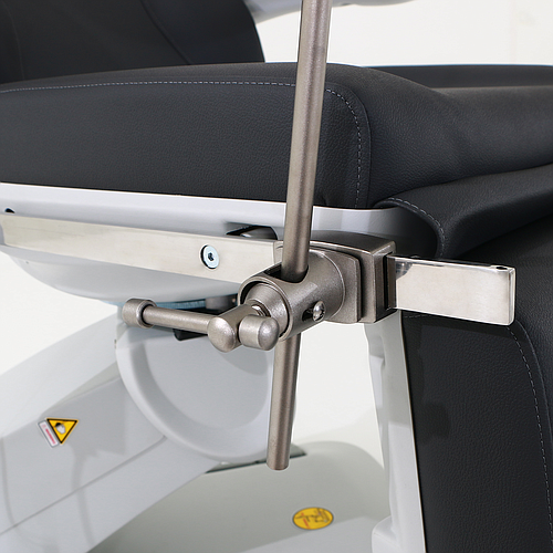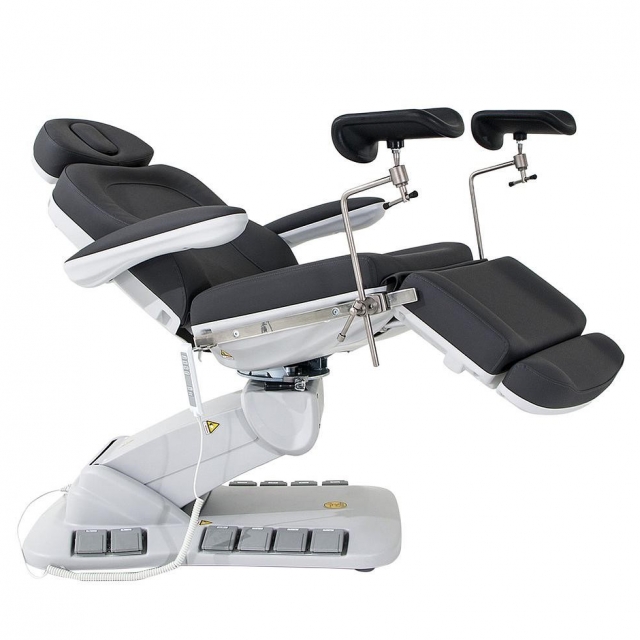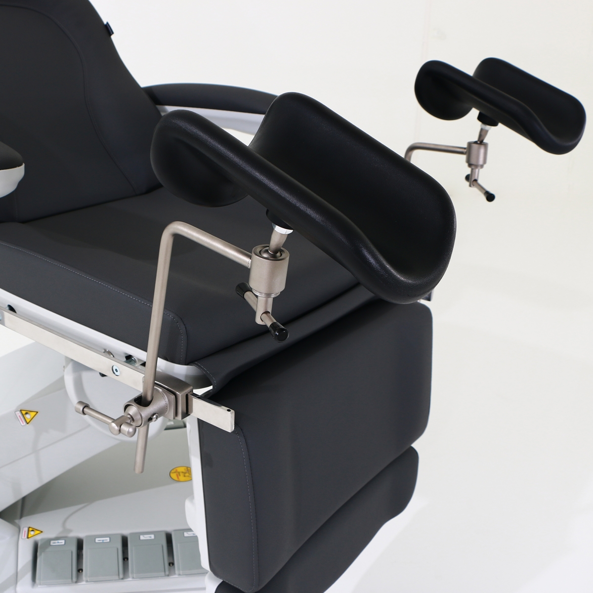Hoogwaardige gynaecologie-stoel; stabiele structuur. Mede ontworpen om werkruimte te optimaliseren dankzij de rotatie van 120°. Vier (4) electro-motoren regelen hoogte, rugverstelling, trendelenburg en voetgedeelte. De electromotoren zijn geluidsarm.