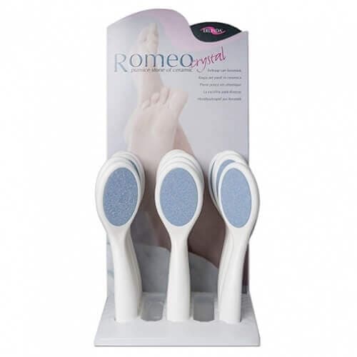 Romeo keramische vijl is keramische voetrasp voor de verwijdering van huidschilvers en hoornhuid. Betere bediening door ergonomisch gevormde handgreep met rubberen onderkant. Rasp met fijne en grove kant. Verwondingsvrije technologie en daarom goed te gebruiken bij diabetici. Snelle reiniging onder stromend water of met desinfectiemiddelen.