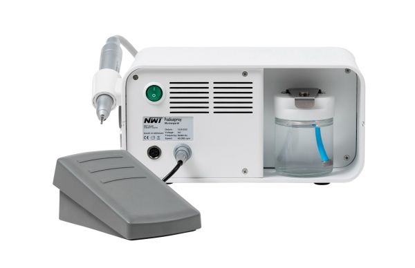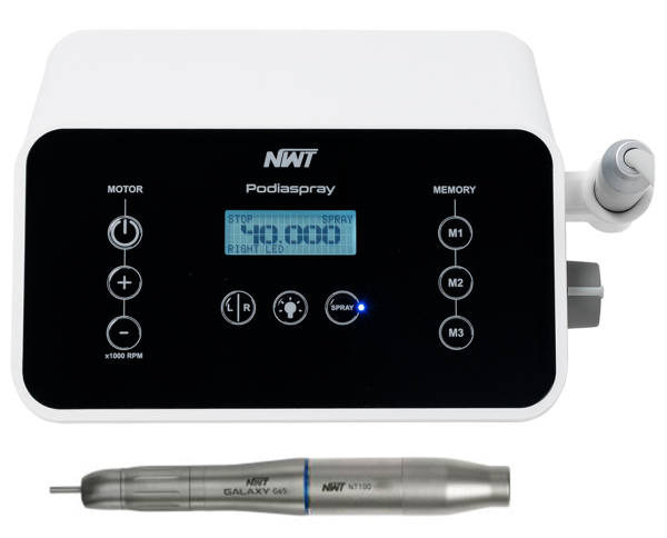 De NWT PodiaSpray is ontworpen voor professionals die op zoek zijn naar een lichte, compacte en gebruiksvriendelijke oplossing. Dankzij moderne, hoogwaardige componenten zoals de geavanceerde Pododent Evo-handstukken en borstelloze micromotoren van NWT, maakt deze unit dagelijks werken efficiënter en comfortabeler.