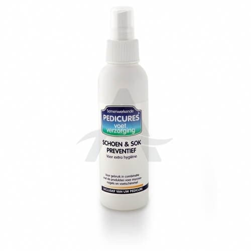 Samenwerkende Pedicures 'Schoen en sok spray' voorkomt de ontwikkeling van voetschimmels en werkt preventief in op de voet. Een succesvolle behandeling van schimmels is alleen blijvend als ook de sokken en de schoenen worden behandeld met Schoen en Sok preventief. De spray komt tot in de kleinste hoekjes en voorkomt het ontstaan van nieuwe voetschimmel. Gebruiken in combinatie met Oplossing voor Voetschimmel of Oplossing voor Mycosenagels. Gebruiksaanwijzing: De schoenen één keer per week van binnen goed sprayen (6 à 8 keer pompen per schoen). De schoenen goed laten drogen. Eventueel ook de sokken na het wassen behandelen en laten drogen. Geschikt voor diabetici.