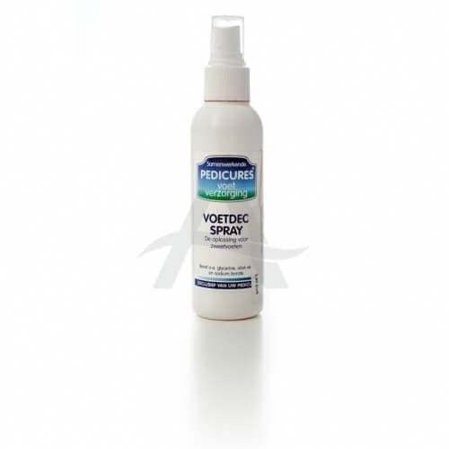 Samenwerkende pedicures voetdeospray. Een heerlijk frisse lotion: De oplossing voor Zweetvoeten, waarmee u transpiratie én de daarmee gepaard gaande nare geur afdoende bestrijdt. Bevat desinfecterende ingrediënten als glycerine en sodium borate. Voor een fris en weldadig gevoel zorgen menthol en eucalyptus. Gebruiksaanwijzing: ’s Morgens na het douchen de voeten goed afdrogen. Een ruime hoeveelheid Voetdeospray aanbrengen en de voeten licht inmasseren, vooral tussen de tenen. Één keer per dag gebruik is voldoende. Geen nare geur meer en de hele dag verzekerd van een fris en schoon gevoel.